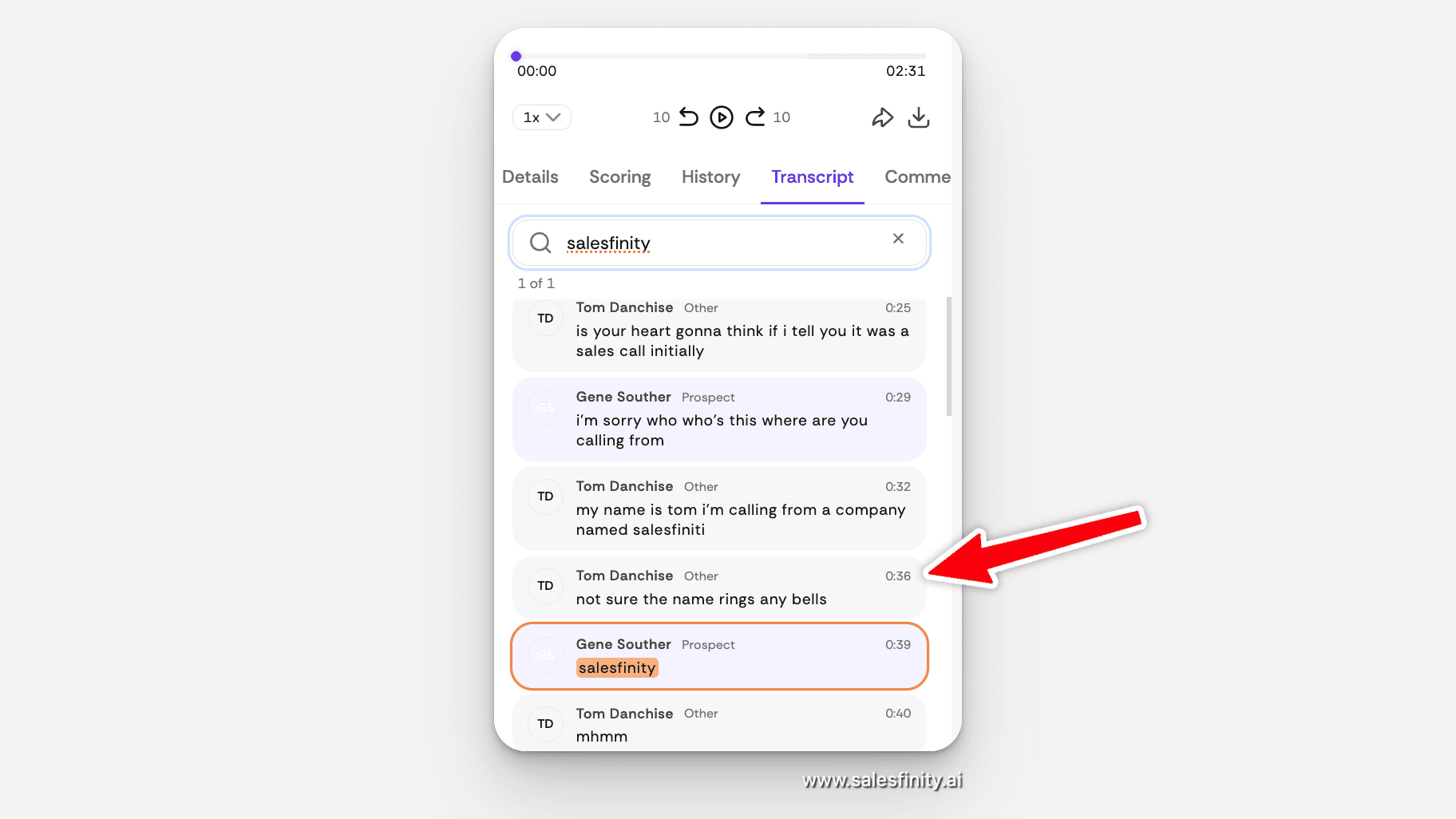 Every Salesfinity call transcript now supports click-to-jump playback and full-text search. When you click a timestamp inside a transcript, the audio jumps to that exact moment. When you search a phrase, every match across the call lights up.
