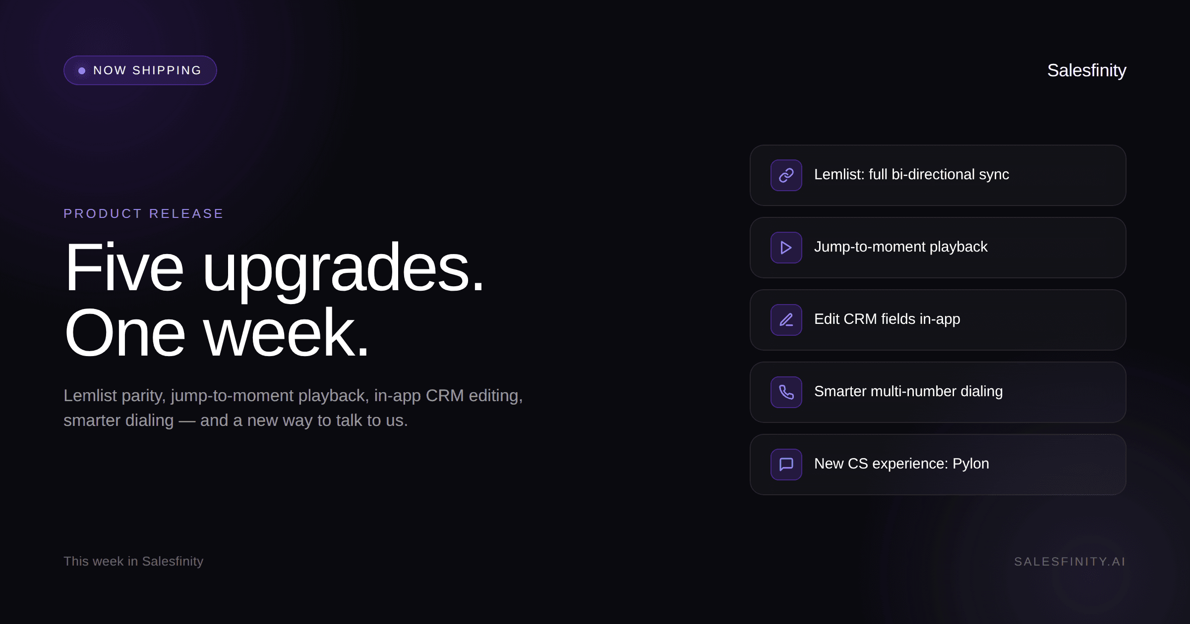 This week we shipped five upgrades to the Salesfinity platform: full bi-directional Lemlist integration (now at parity with Outreach and Salesloft), jump-to-moment call transcript playback, in-app CRM field editing for HubSpot and Salesforce, smarter multi-number dialing that automatically rolls to the next number on dead-end dispositions, and a new Pylon-powered customer support experience.