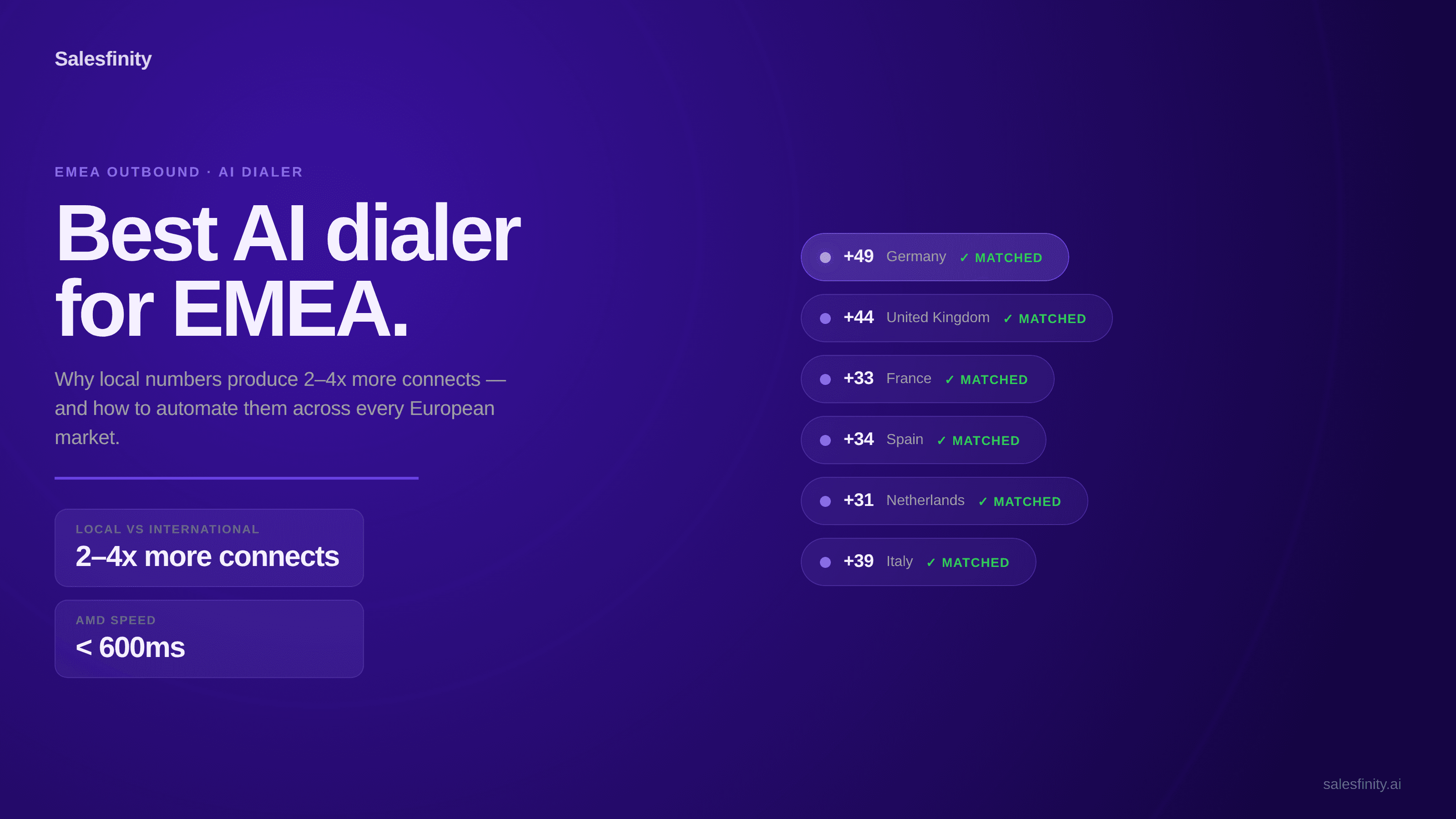 The best parallel dialer for EMEA needs to automatically match the country code of each prospect's phone number and route the call through a local number from that country — without manual switching or list segmentation. It also needs sub-second answering machine detection, native GDPR compliance, and CRM integrations that handle multi-country campaign data cleanly. Salesfinity is the only AI parallel dialer that combines automatic country code matching, 600ms AMD via Lightning Mode, waterfall data enrichment across eight providers, and native Salesforce Sales Engagement integration in a single platform.