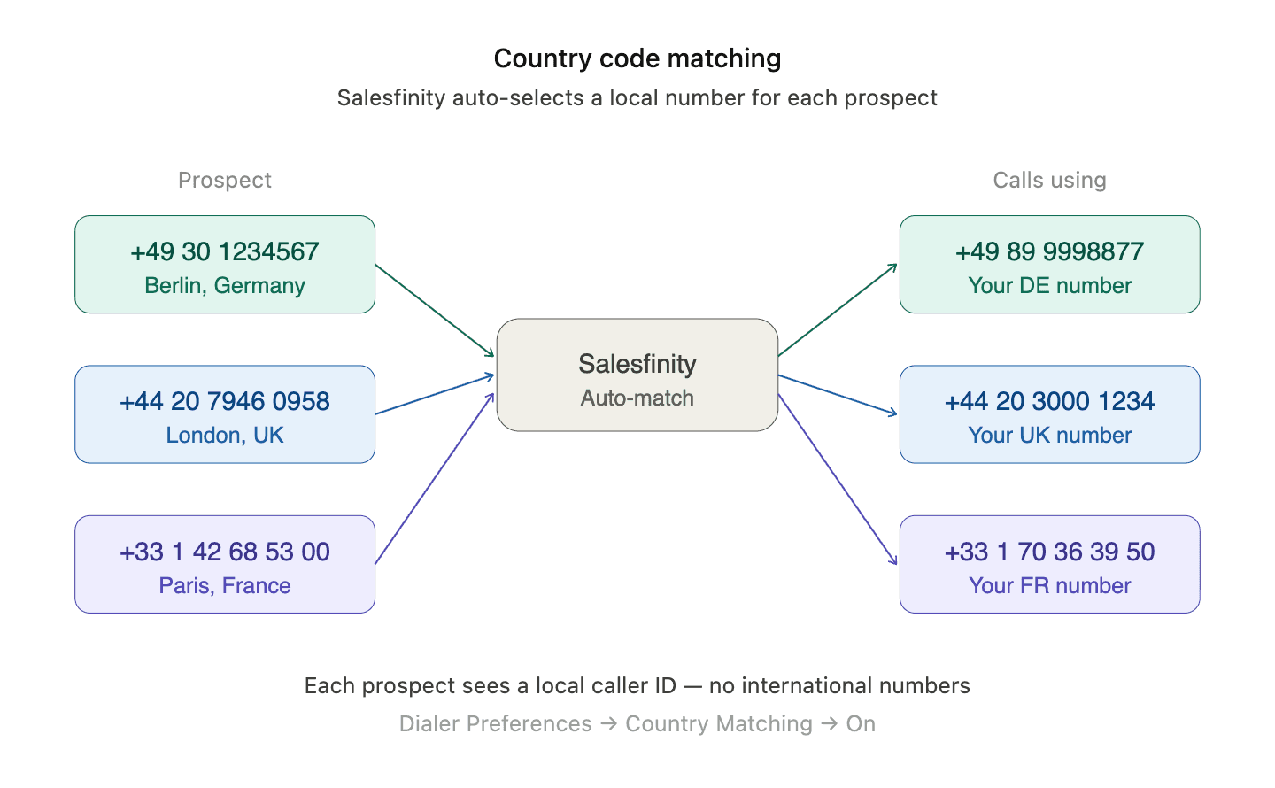 Salesfinity's Country Code Matching does exactly this. You turn it on once in Dialer Preferences and it works on every dial, in every campaign, automatically. The system reads the prospect's number, matches it to a local number in your pool, and routes the call — all before the first ring.
