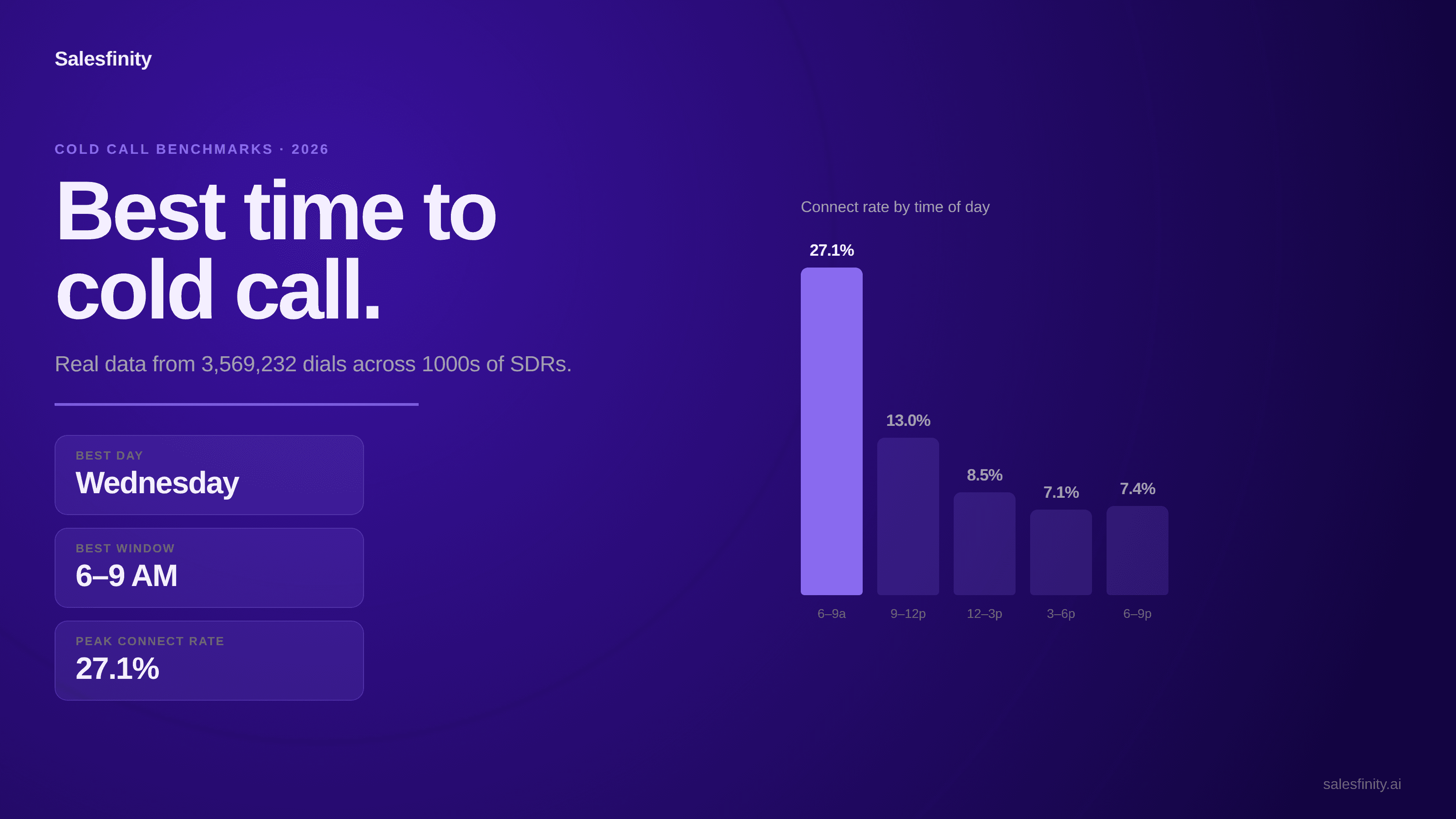 Most "best time to call" advice is recycled from studies done in 2019. We analyzed 3,569,232 dials across thousands of SDR teams using Salesfinity in 2026. Here's what the data actually says — and why timing is only one piece of the puzzle.