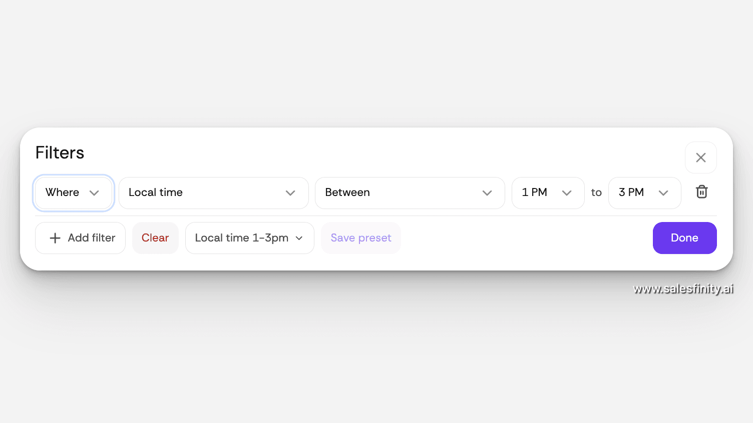 Call Prospects at the Right Time | Local Time Filter & Filter Presets — Salesfinity Meta Description: Salesfinity's new Local Time Filter lets SDRs call prospects during their peak pickup hours based on exact local time — not just time zone. Plus, save any filter as a one-click preset.