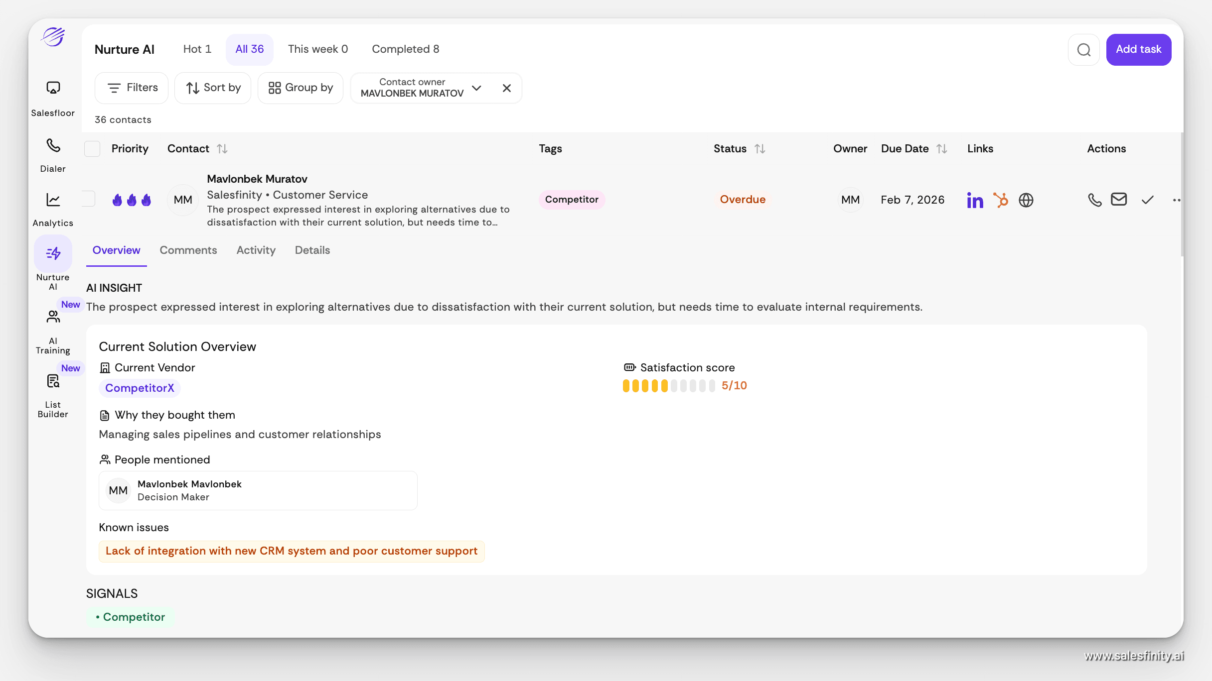 Nurture AI automatically identifies when and why prospects should be followed up with, using real sales conversations as signals. With Nurture AI 2.0, Salesfinity users can act on those follow-ups faster, stay consistent across long sales cycles, and reduce missed opportunities.