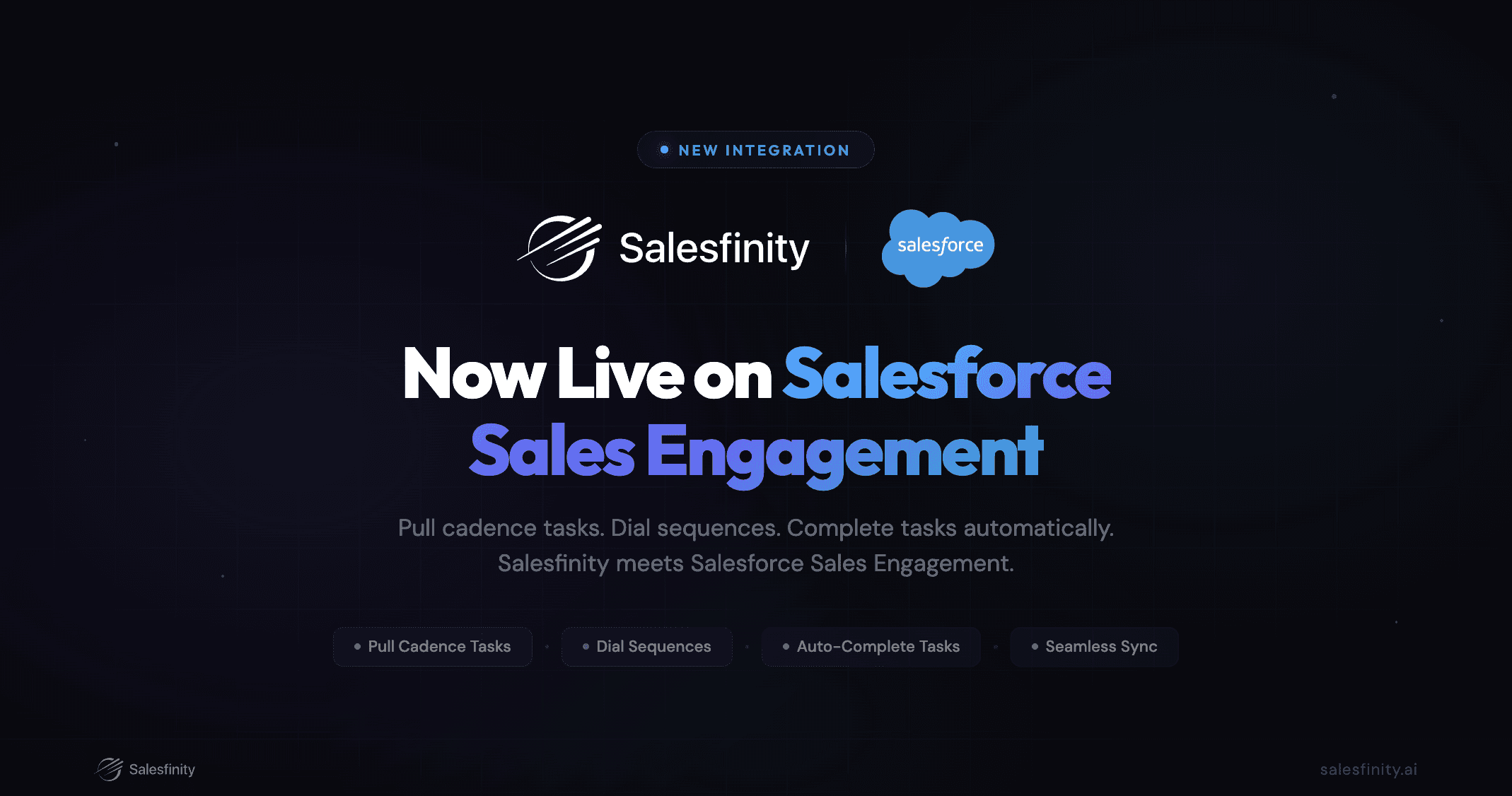 Today, we're announcing something enterprise sales teams have been waiting for: Salesfinity now integrates directly with Salesforce Sales Engagement — the cadence and sequence engine inside Salesforce. This makes Salesfinity the only AI parallel dialer that natively connects to the Salesforce Sales Engagement platform, allowing SDR and BDR teams to pull cadence tasks, dial through sequences, and auto-complete tasks without ever leaving the dialer.